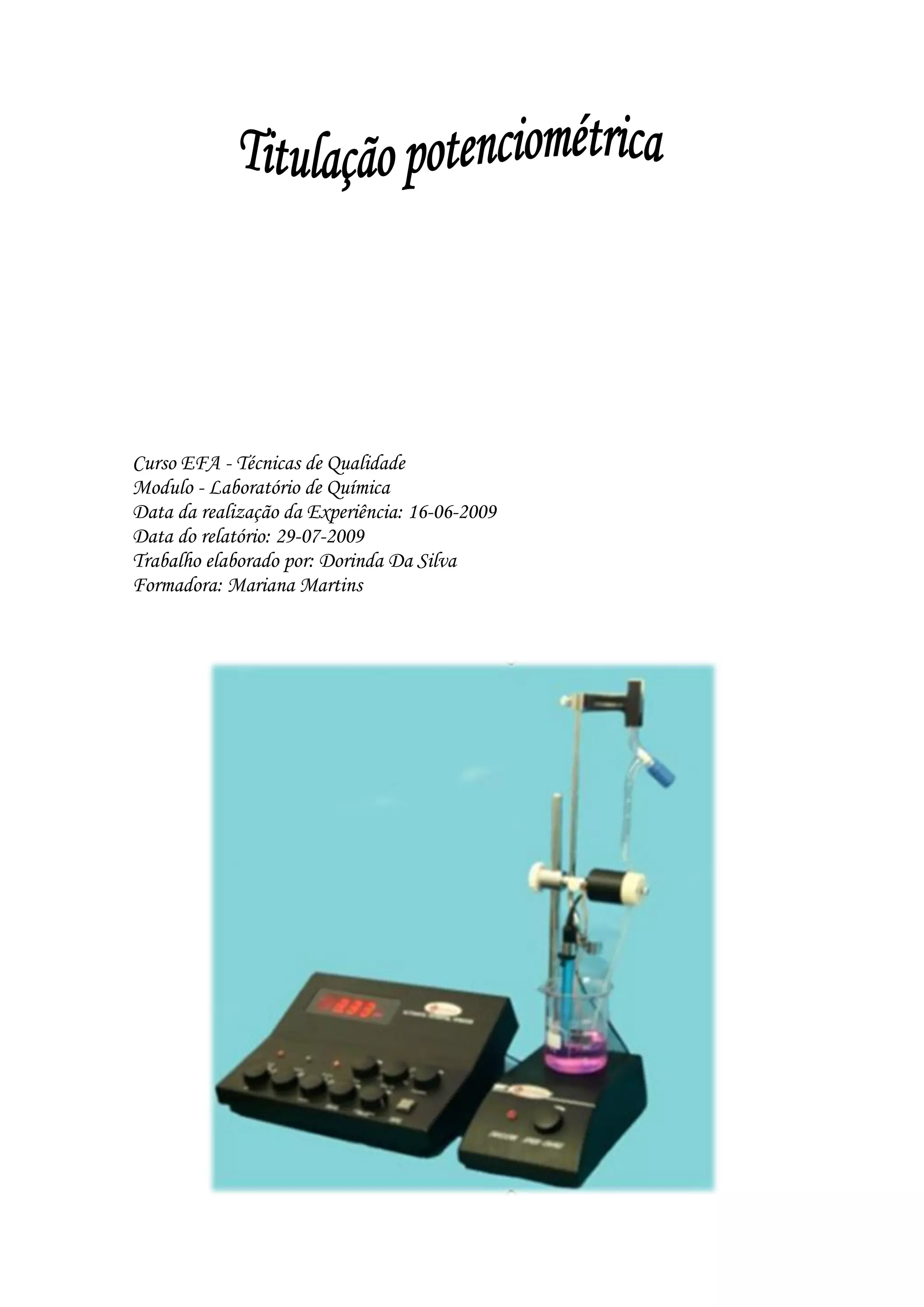 Este documento descreve uma experiência de titulação potenciométrica realizada para determinar a concentração de uma solução de ácido clorídrico desconhecida. A titulação envolveu adicionar gradualmente uma solução de hidróxido de potássio a uma amostra de ácido clorídrico, medindo o pH após cada adição. O gráfico de pH vs volume de titulante mostrou um ponto de inflexão em pH 6,31, indicando o ponto de equivalência e permitindo calcular a concentração da solução de