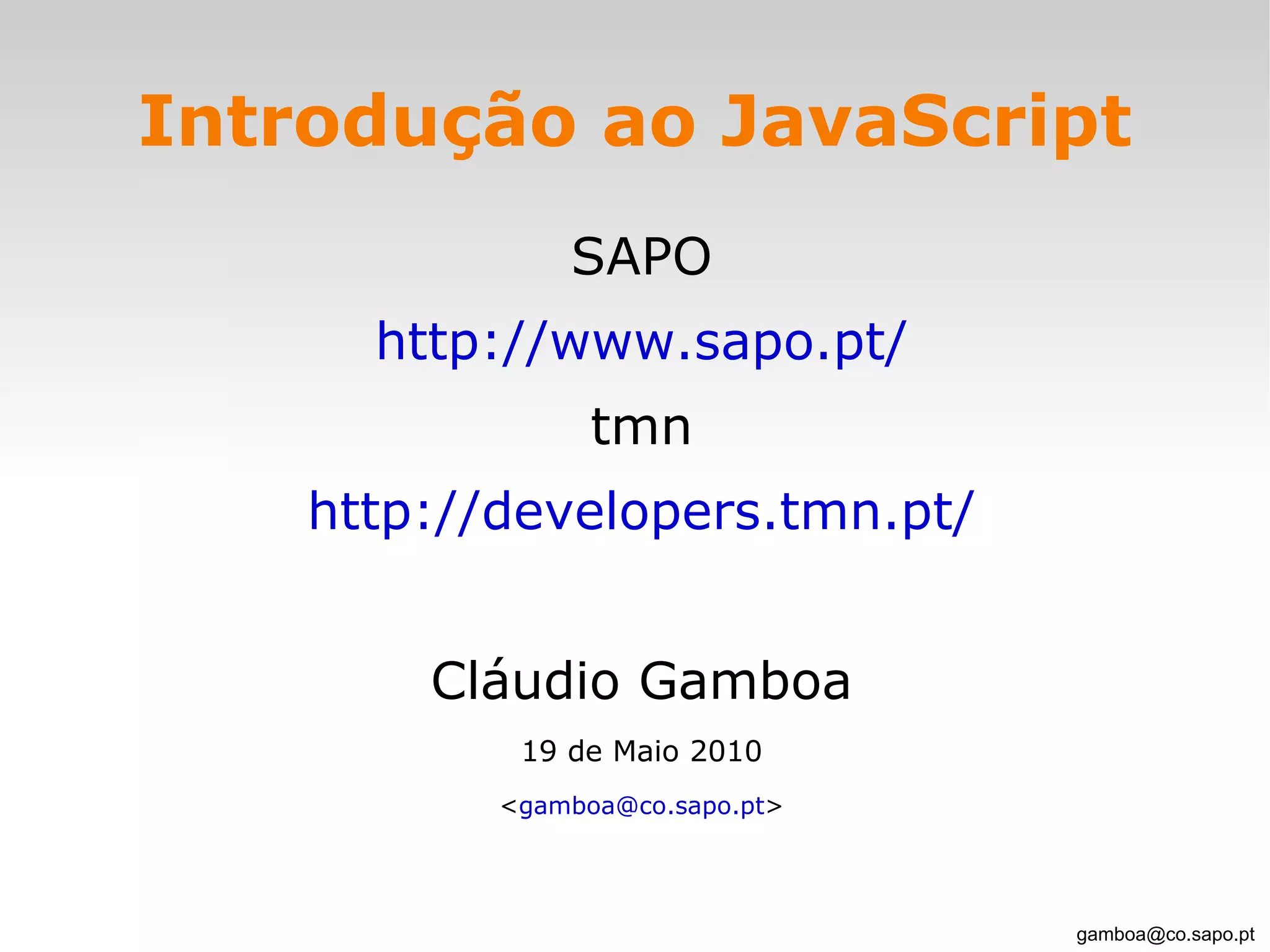 1) O documento introduz conceitos básicos de JavaScript, incluindo variáveis, tipos, operadores e estruturas de controlo. 2) É explicado que JavaScript permite a criação e manipulação de objetos, sendo estas as estruturas de dados fundamentais da linguagem. 3) O documento descreve também funções e scopes em JavaScript, esclarecendo que cada função define o seu próprio escopo.