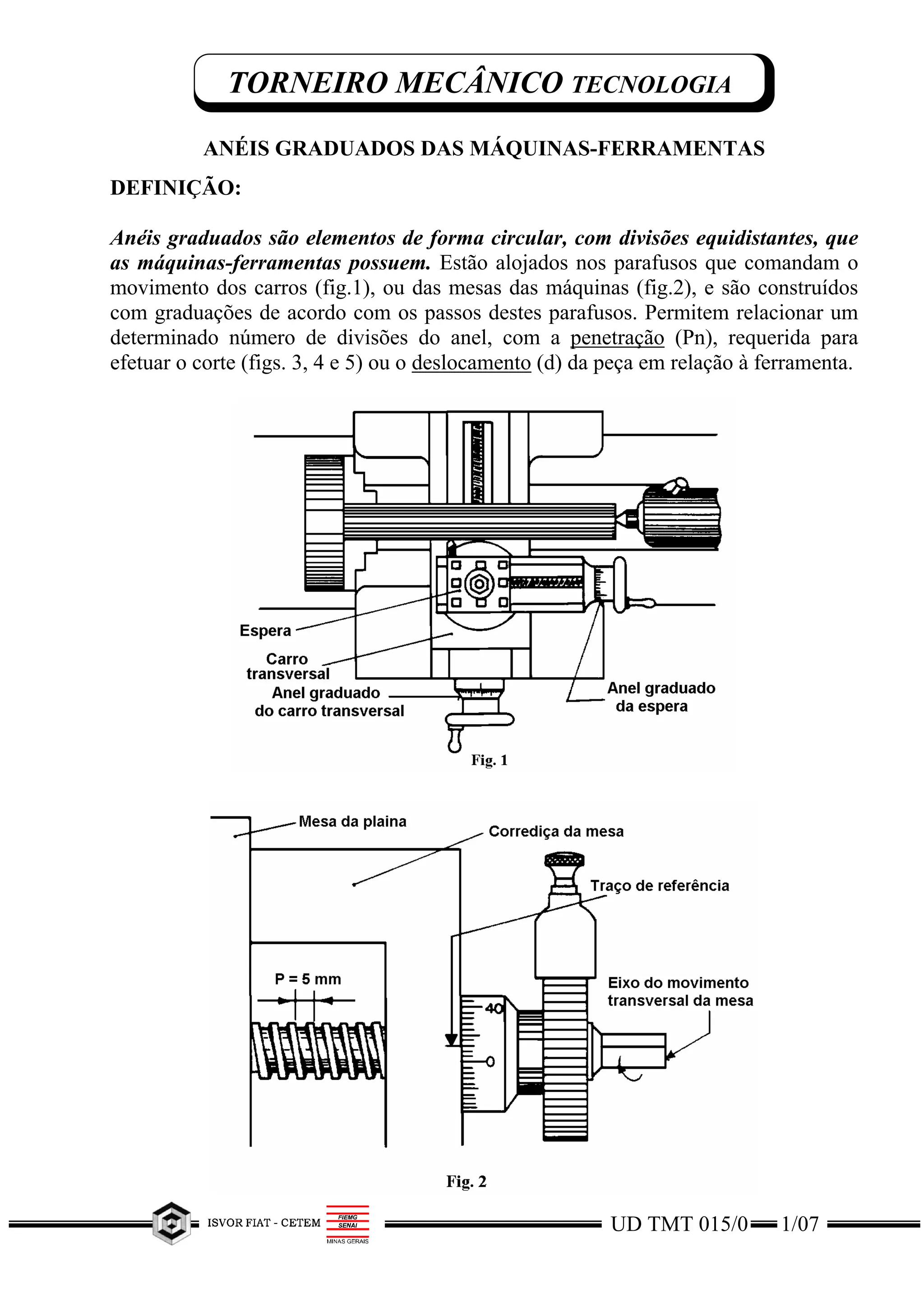 O documento descreve anéis graduados em máquinas-ferramentas e como eles são usados para calcular a penetração correta da ferramenta. Explica como calcular o número de divisões a avançar no anel graduado com base na penetração desejada, passo do parafuso e número de divisões. Também mostra como calcular a inclinação correta do carro superior para obter a penetração desejada ao avançar uma divisão.