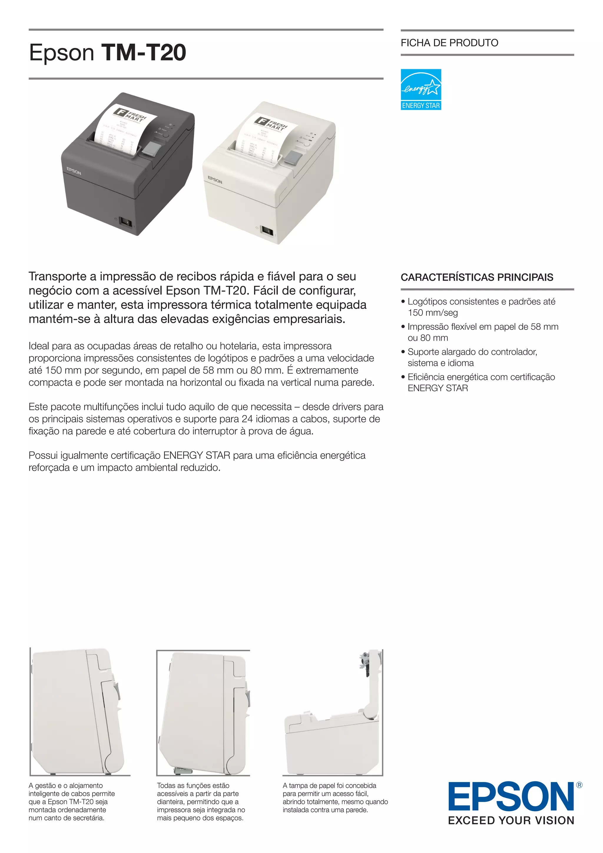 A Epson TM-T20 é uma impressora térmica compacta e eficiente energeticamente ideal para retalho e hotelaria, capaz de impressões rápidas e consistentes em papel de 58 ou 80mm. Inclui drivers, suporte multilingue e acessórios de instalação.