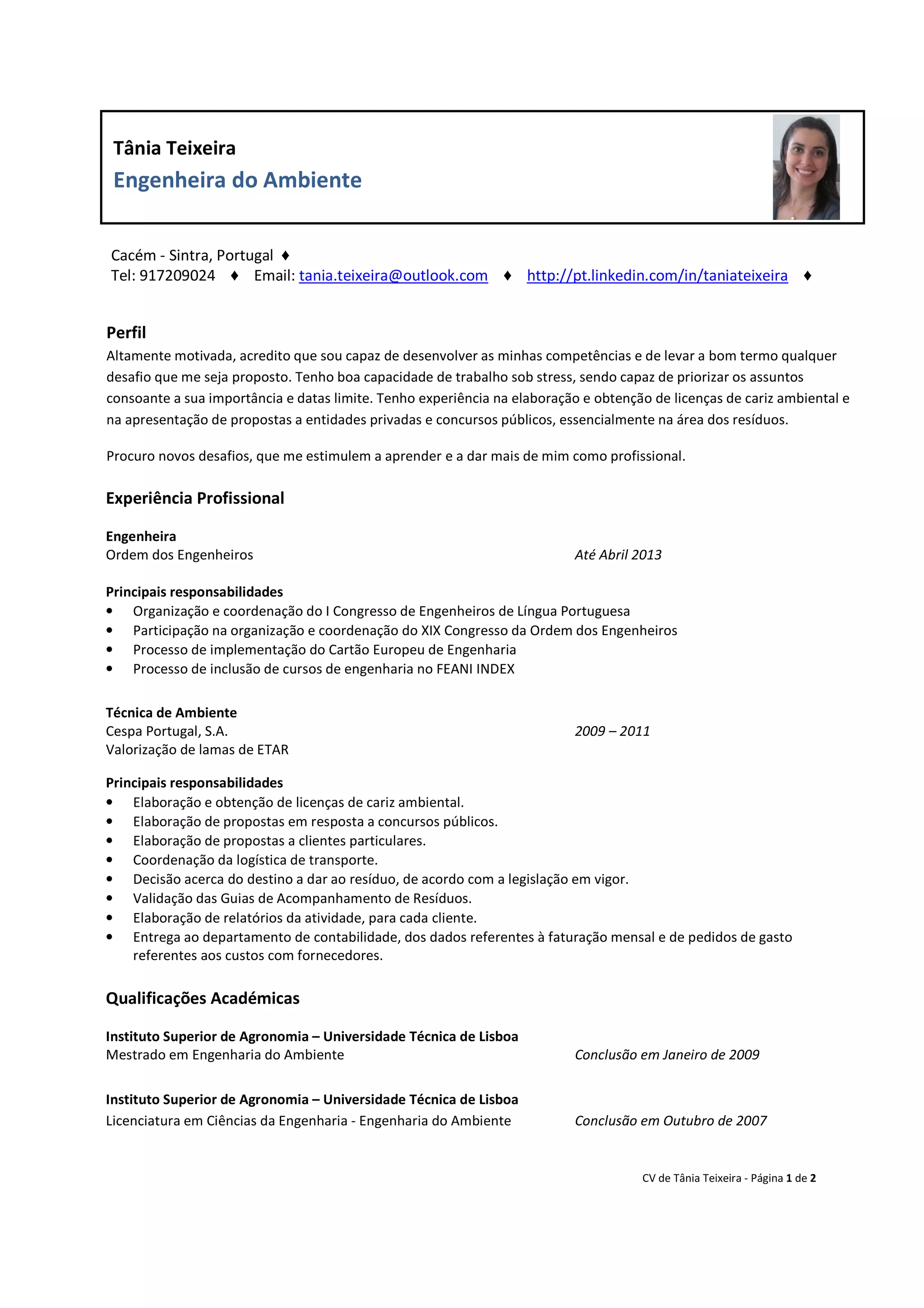 Tânia Teixeira é uma engenheira do ambiente portuguesa com experiência na obtenção de licenças ambientais e na elaboração de propostas para clientes privados e concursos públicos na área dos resíduos. Ela tem um mestrado em engenharia do ambiente e procura novos desafios profissionais.
