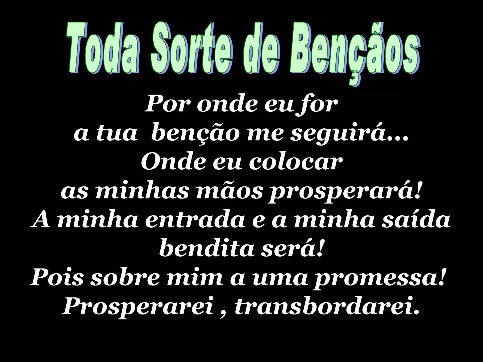 O documento descreve as bênçãos divinas que acompanharão a pessoa onde quer que ela vá e tudo que fizer. Ele afirma que a entrada e saída da pessoa serão abençoadas, seus celeiros transbordarão, sua casa terá provisão, e onde pisar possuirá, pois há uma promessa de prosperidade e transbordamento. Ele também diz que a pessoa será abençoada para a direita, esquerda, frente e trás em tudo que fizer.