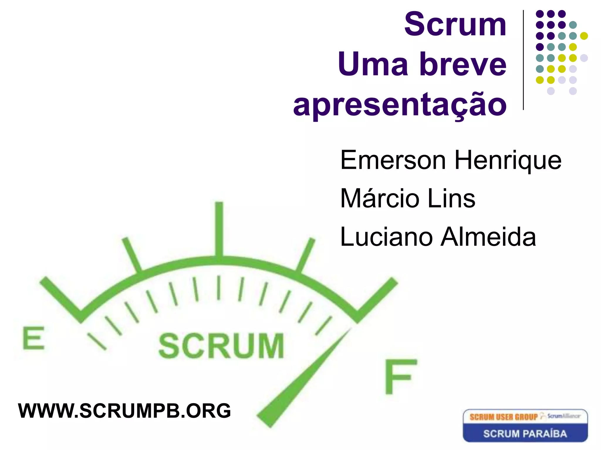 Scrum é uma estratégia ágil para desenvolvimento de software baseada em pequenas equipes autônomas que entregam software de forma incremental a cada "sprint". O documento descreve os principais conceitos de Scrum como backlog, sprints, reuniões diárias e revisões ao final de cada sprint.