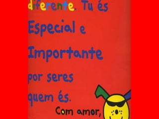 O documento lista várias características e situações que não são consideradas negativas, como ter dentes ausentes, pedir ajuda, ter aparência física diferente, usar óculos, expressar sentimentos, ter origens diferentes ou preferências não convencionais. A mensagem central é que as pessoas não devem se sentir envergonhadas ou julgadas por suas diferenças individuais.