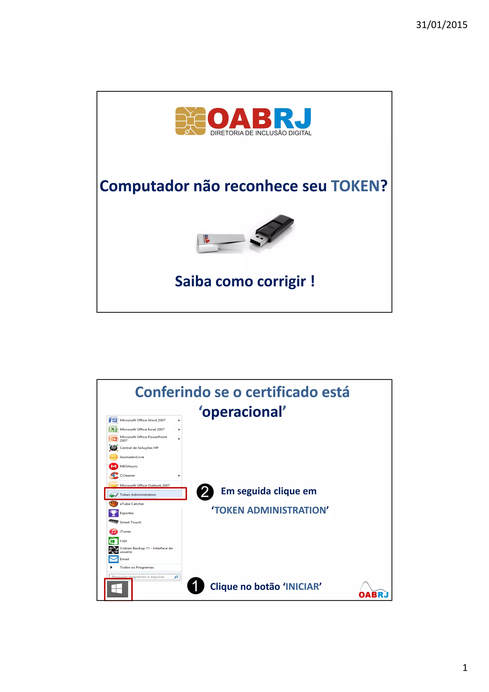 O documento fornece um guia passo a passo para resolver problemas de reconhecimento de um token em um computador. Instruções incluem verificar o status do certificado, acessar o gerenciador de dispositivos e desinstalar o leitor de cartão inteligente para reinstalá-lo. Agradecimentos são feitos a um técnico pela solução apresentada.