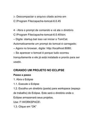 O documento fornece instruções para configurar o Apache Tomcat 7.0 no Windows, incluindo como fazer o download do Tomcat, descompactá-lo em um diretório, iniciar o servidor e verificar se está funcionando corretamente no navegador. Também explica como criar um projeto no Eclipse para desenvolvimento web usando o Tomcat como container.