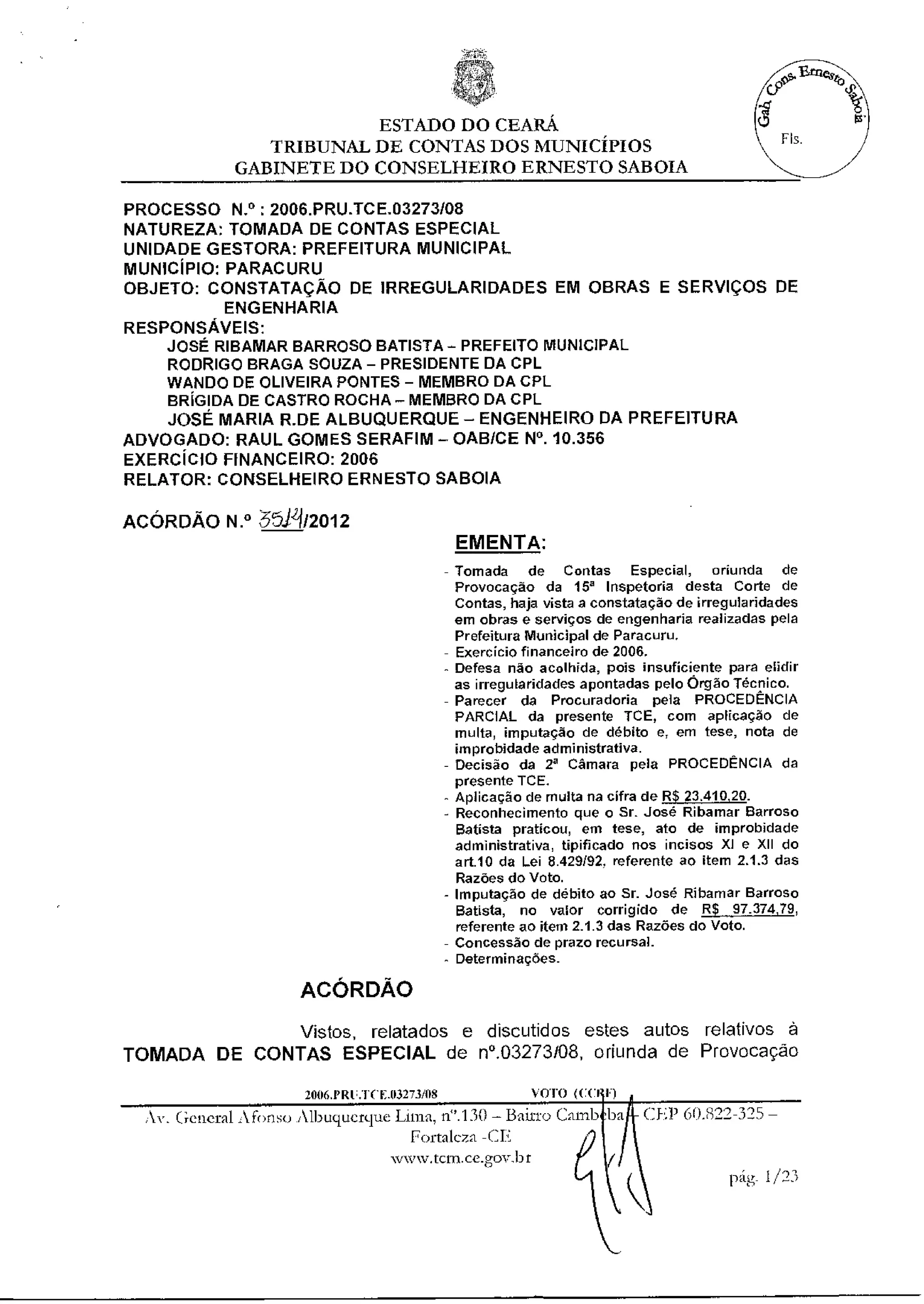 O documento descreve uma tomada de contas especial realizada pelo Tribunal de Contas dos Municípios do Ceará contra a Prefeitura Municipal de Paracuru em 2006. Foi constatada irregularidades em obras e serviços de engenharia e aplicadas multas ao prefeito, membros da comissão de licitação e engenheiro responsáveis, no total de R$23.410,20. Também foi reconhecido ato de improbidade administrativa e imputado débito de R$97.374,79 ao prefeito.