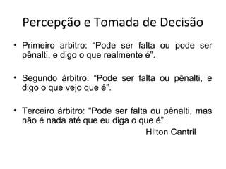 O documento discute como a percepção influencia a tomada de decisão. A percepção é definida como o processo de organizar e interpretar impressões sensoriais para dar sentido ao ambiente. Vários fatores como atitudes, experiências e expectativas podem influenciar a percepção de uma pessoa. A percepção é importante porque o comportamento se baseia na percepção da realidade, não na realidade em si. A tomada de decisão racional envolve várias etapas, mas na prática a percepção influencia todo o processo decisório.