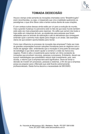 O documento discute como as empresas estão cada vez mais buscando soluções inovadoras para agregar valor aos seus negócios, mas que requerem alto investimento. É importante buscar metodologias para reduzir esses custos e tomar decisões para investir em processos, pessoas e sistemas que preparem a empresa para um mercado cada vez mais profissionalizado e competitivo.