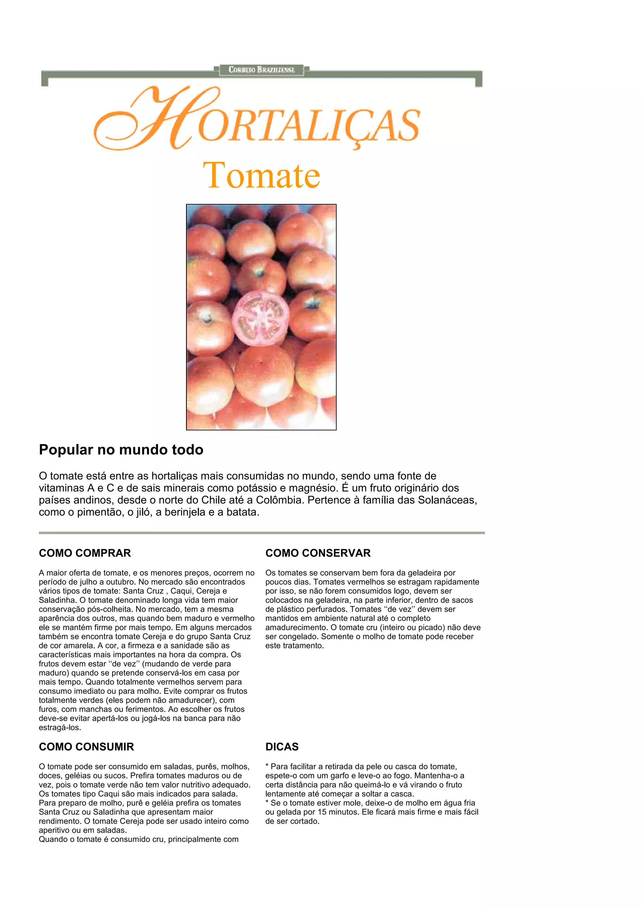 O tomate é uma hortaliça popular consumida no mundo todo, rica em vitaminas e sais minerais. Os melhores meses para comprar tomates no mercado são de julho a outubro. Tomates devem ser armazenados fora da geladeira e lavados antes do consumo para remover resíduos.
