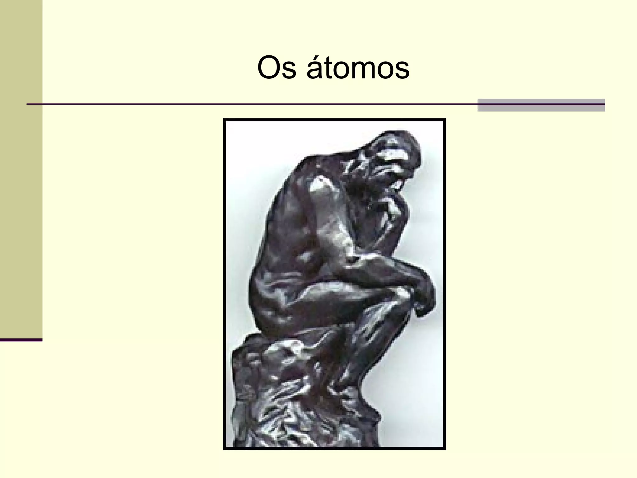 O documento descreve a evolução do modelo atômico ao longo do tempo, desde a ideia original dos gregos de que os átomos eram partículas indivisíveis até os modelos modernos com núcleo e nuvem eletrônica. Começa com Demócrito e Leucipo na Grécia Antiga, passa por Dalton, Thomson, Rutherford, Bohr e chega ao modelo atual de Schrödinger.