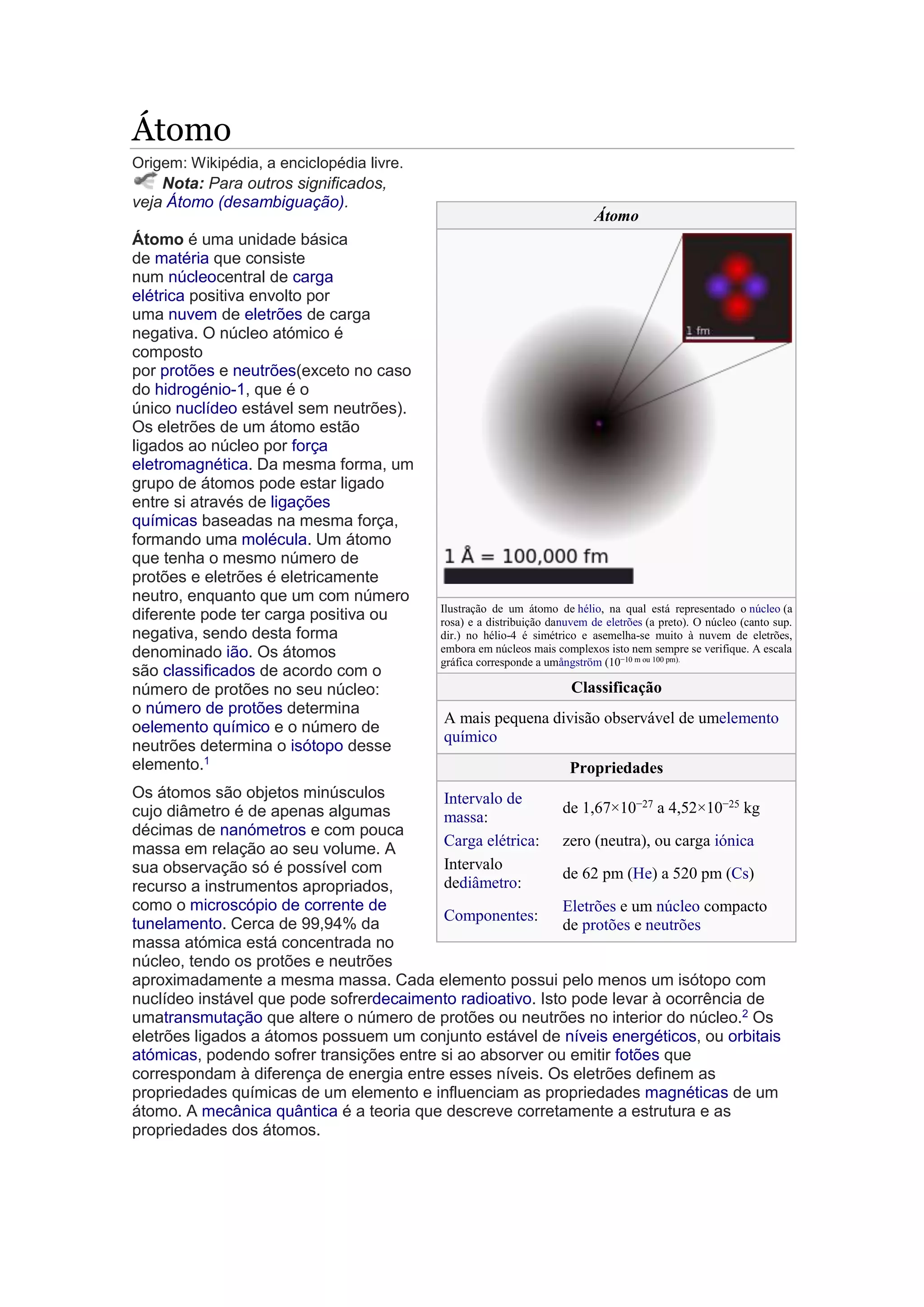 1) Um átomo é a menor unidade de matéria que consiste em um núcleo central positivo rodeado por eletrões negativos.