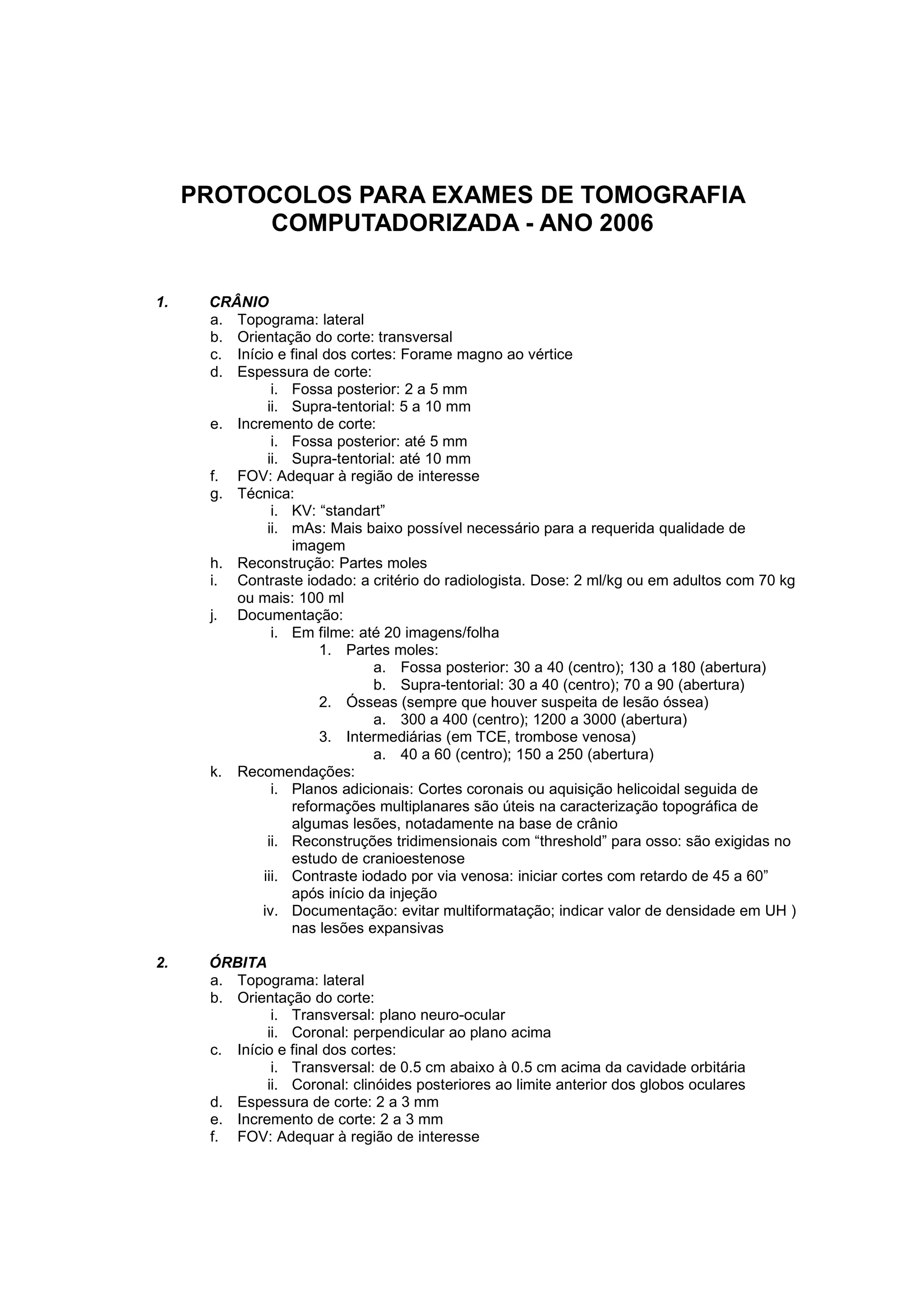 1. O documento apresenta protocolos para tomografia computadorizada de diversas regiões do corpo, incluindo crânio, órbita, sela turca, ossos temporais, face, pescoço, tórax, ATM e pesquisa de tromboembolismo pulmonar.