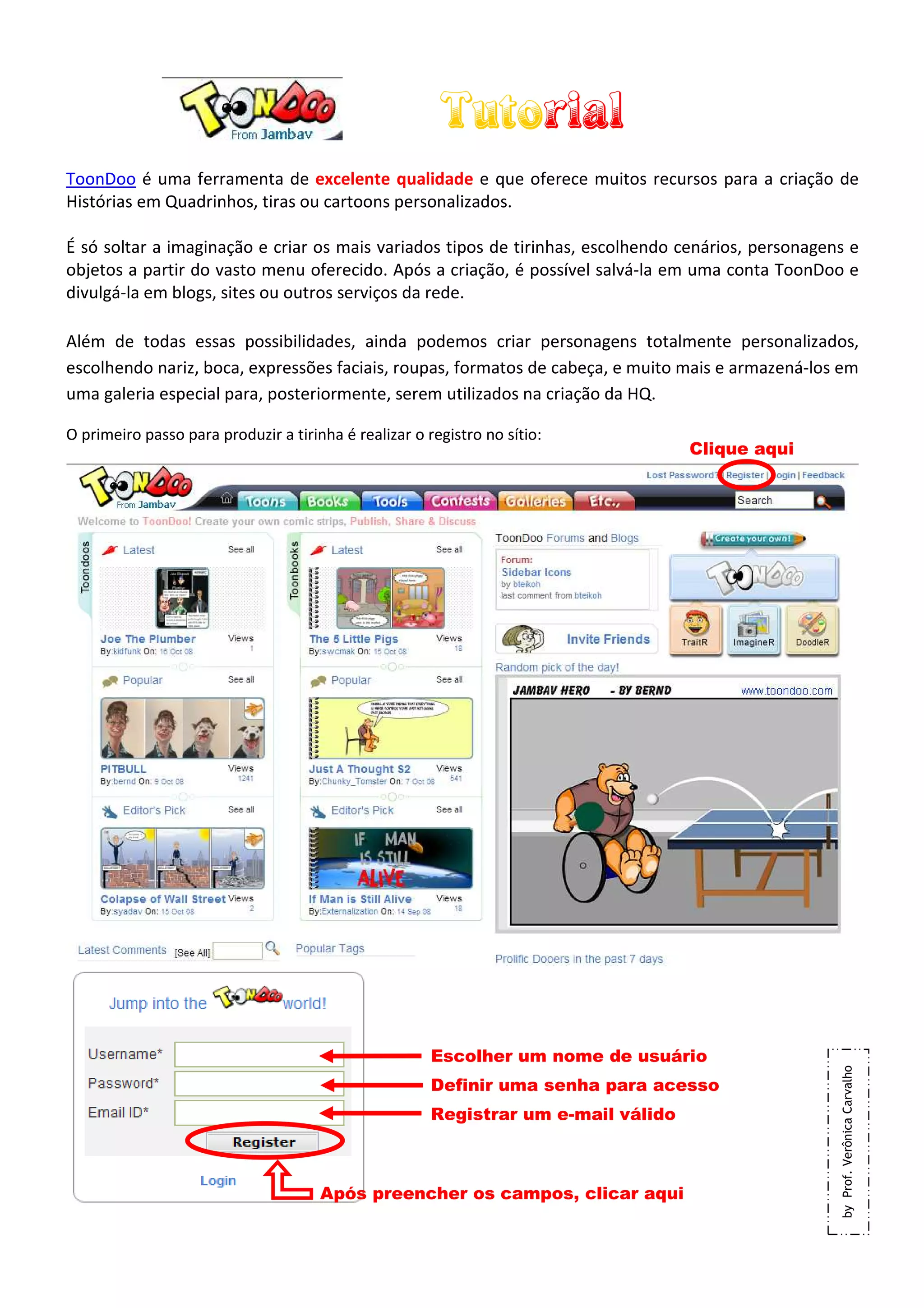 Tutorial ToonDoo é umaferramenta de excelente qualidade e que oferece muitos recursos para a criação de Histórias em Quadrinhos, tiras ou cartoons personalizados. É só soltar a imaginação e criar os mais variados tipos de tirinhas, escolhendo cenários, personagens e objetos a partir do vasto menu oferecido. Após a criação, é possível salvá-la em uma conta ToonDoo e divulgá-la em blogs, sites ou outros serviços da rede. Além de todas essas possibilidades, ainda podemos criar personagens totalmente personalizados, escolhendo nariz, boca, expressões faciais, roupas, formatos de cabeça, e muito mais e armazená-los em uma galeria especial para, posteriormente, serem utilizados na criação da HQ. O primeiro passo para produzir a tirinha é realizar o registro no sítio: Clique aqui Escolher um nome de usuário by Prof. Verônica Carvalho Definir uma senha para acesso Registrar um e-mail válido Após preencher os campos, clicar aqui
