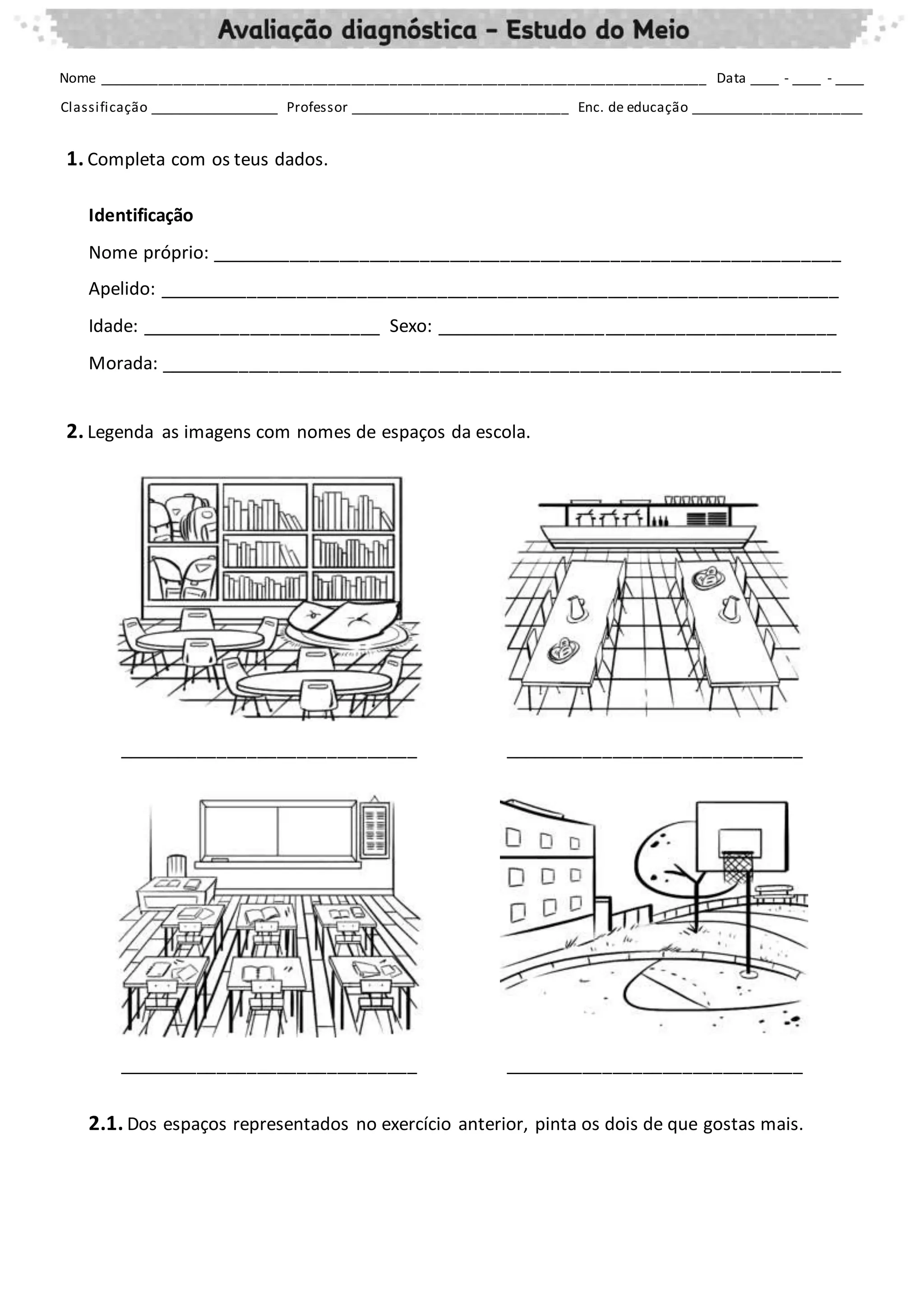 Este documento contém 11 exercícios sobre Estudo do Meio. Os exercícios abordam tópicos como identificação pessoal, partes do corpo e da casa, estações do ano, ciclo de vida de animais e plantas. O aluno deve completar informações, fazer correspondências, ordenar imagens e realizar outras atividades para demonstrar seu conhecimento sobre esses assuntos.