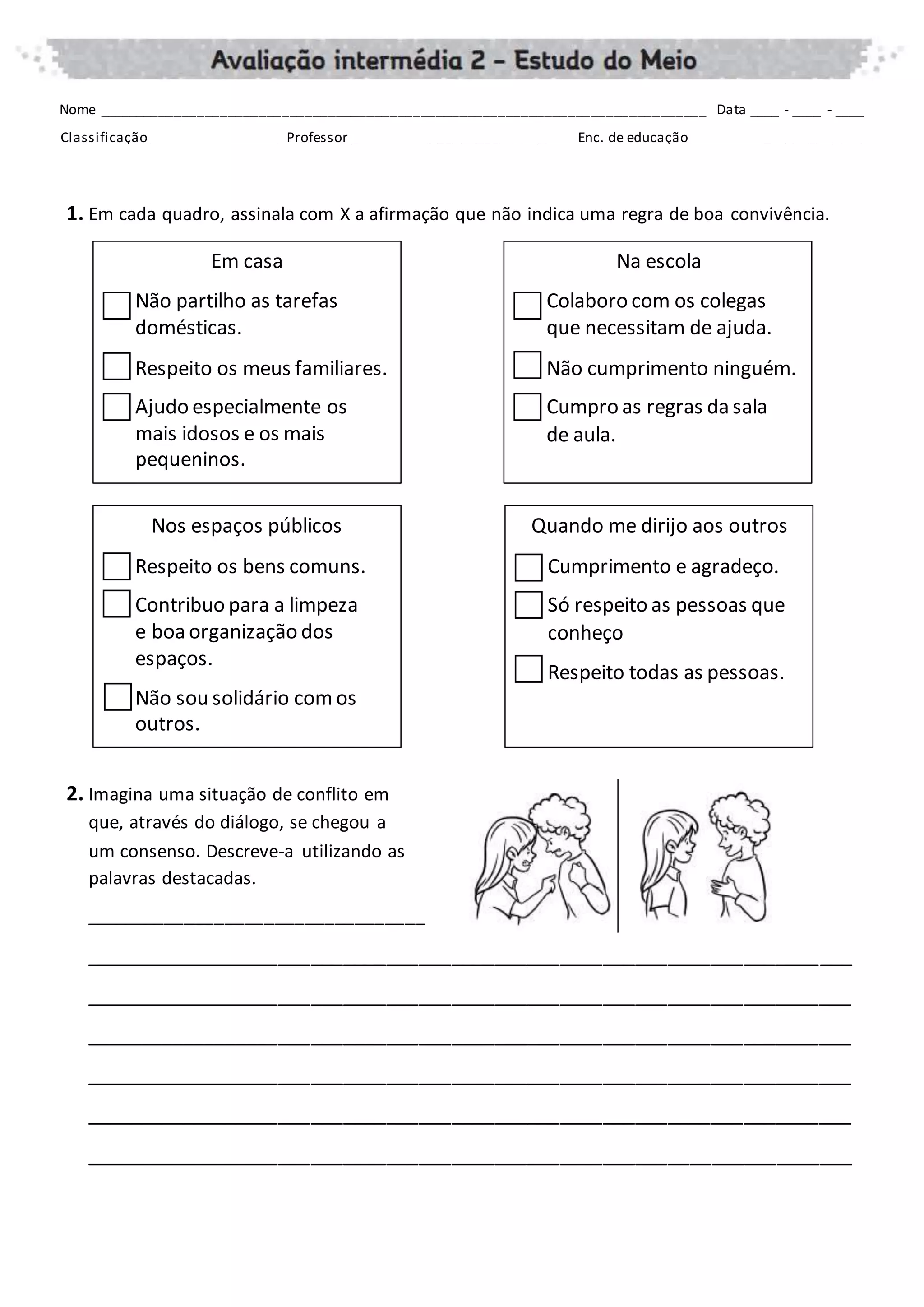 Este documento apresenta um conjunto de exercícios sobre boas regras de convivência, profissões, materiais e serviços comunitários. Os alunos devem identificar afirmações que não indicam boa convivência, descrever uma situação de conflito resolvida através do diálogo, encontrar nomes de profissões em uma sopa de letras e associá-los a suas funções, ligar objetos aos materiais usados em sua fabricação, e identificar instituições e os serviços que prestam.