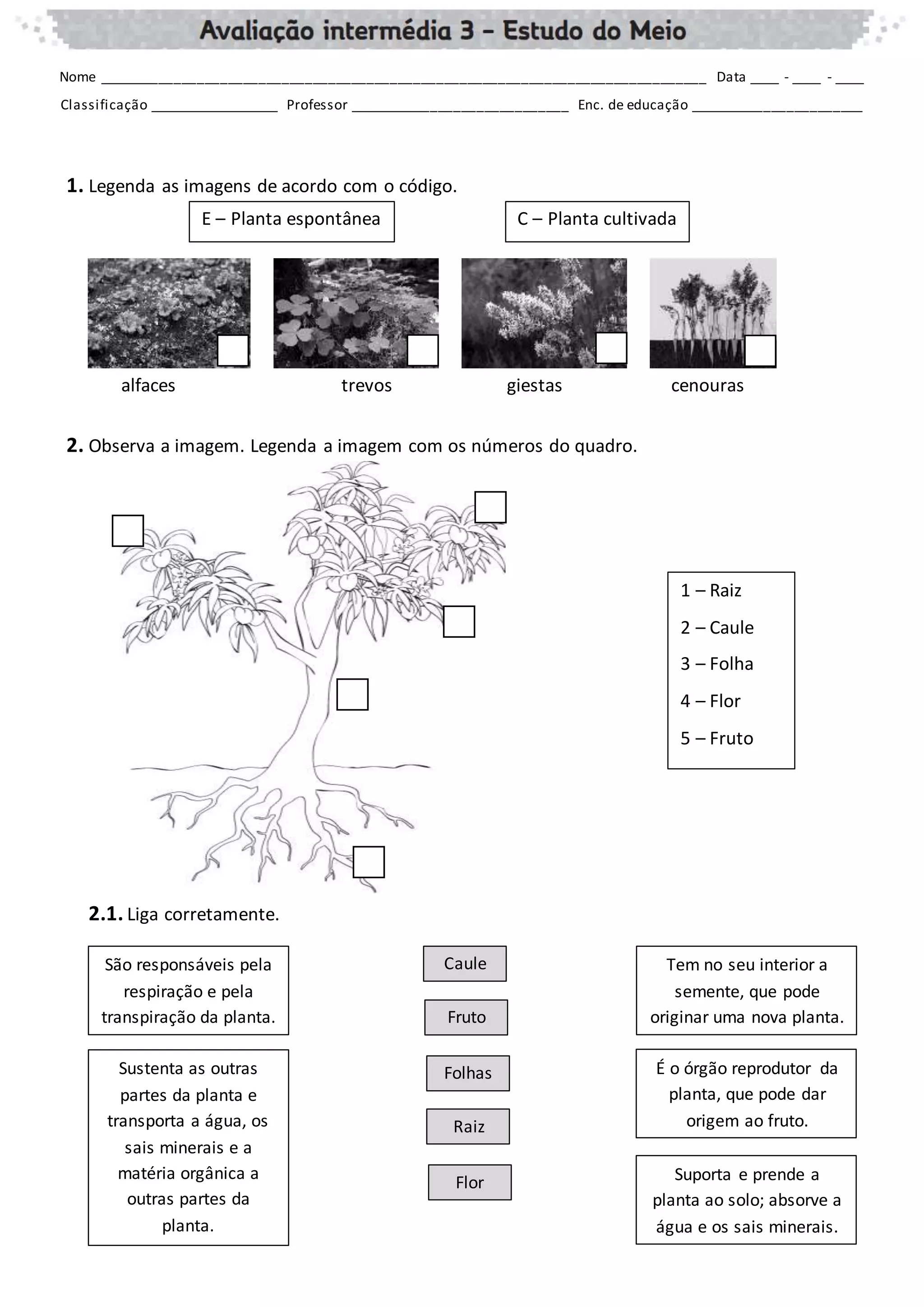 Este documento fornece instruções para preencher uma avaliação sobre plantas e animais. Inclui identificar diferentes partes de plantas, saber se afirmações sobre árvores são verdadeiras ou falsas, e completar informações sobre habitats e características de animais.