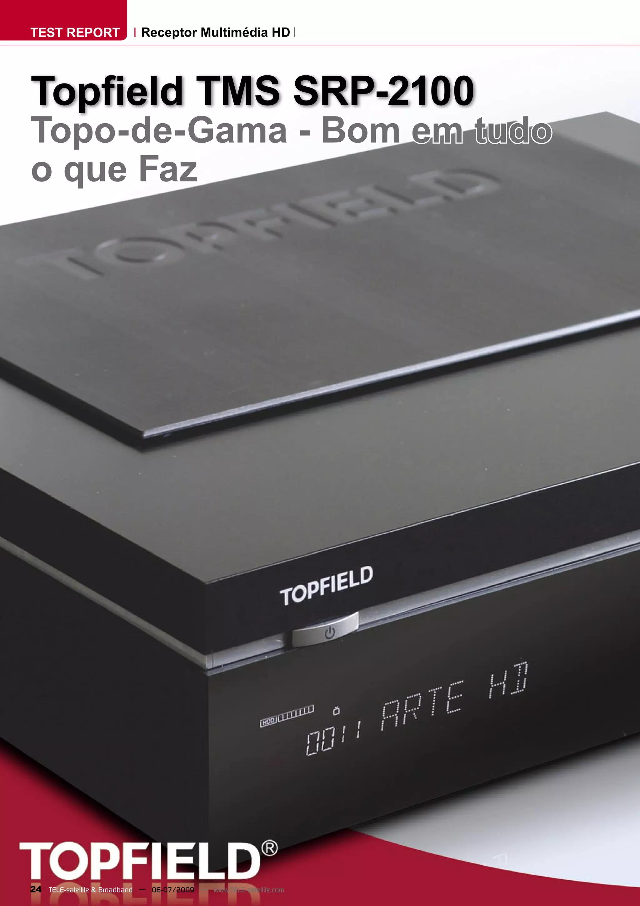 O documento resume um teste de um receptor de TV por satélite da Topfield chamado TMS SRP-2100. Em três frases: