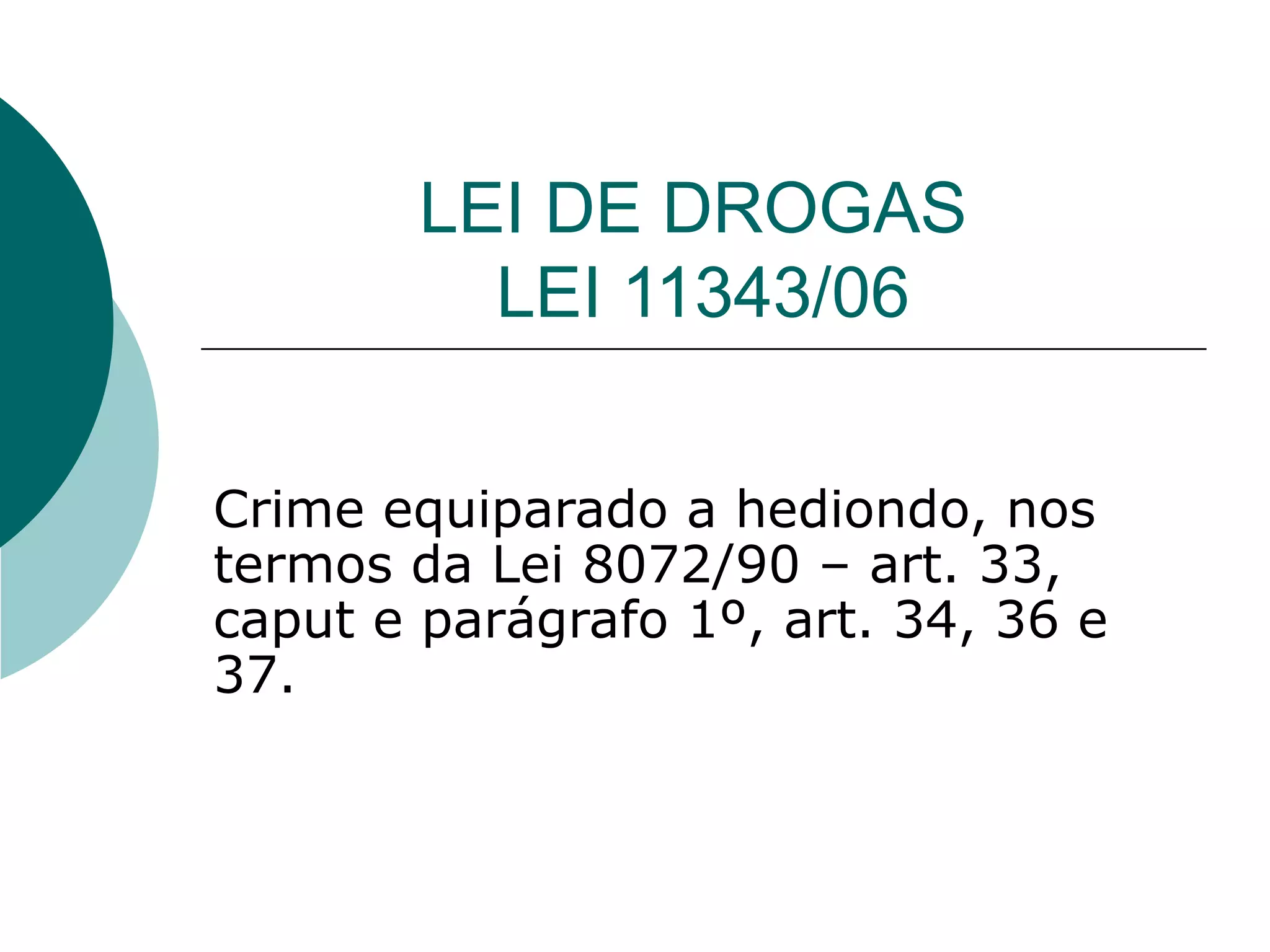 O documento resume a Lei de Drogas 11343/06, definindo crimes relacionados a drogas como equiparados a hediondos e distinguindo condutas de usuários e traficantes. Também trata de associação para o tráfico, financiamento de tráfico, causas de aumento e diminuição de penas, e inimputabilidade por dependência química.