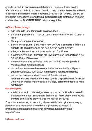 O documento descreve os principais tipos de erros que podem ocorrer em medições topográficas, como erros naturais, instrumentais e pessoais. Também apresenta os principais equipamentos e métodos utilizados para medição direta de distâncias em levantamentos topográficos, como fitas, trenas e métodos com múltiplos lances.