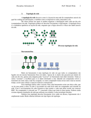 O documento descreve diferentes tipos de topologias de rede, incluindo topologias físicas e lógicas. Ele explica conceitos como barramento, anel, estrela, árvore, híbrida e malha, descrevendo como cada uma organiza a conexão entre dispositivos de rede. O documento também discute como os dados fluem através de cada tipo de topologia.
