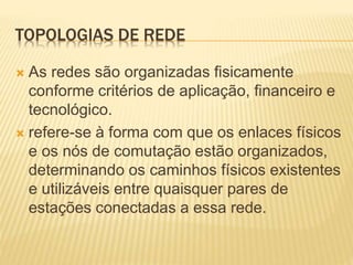 O documento descreve as principais topologias de redes de computadores, incluindo ponto a ponto, barramento, anel, estrela, árvore, malha e sem fio. Cada topologia possui vantagens e desvantagens em termos de desempenho, custo, facilidade de instalação e tolerância a falhas. Uma rede híbrida combina duas ou mais topologias para expandir ou integrar redes existentes.