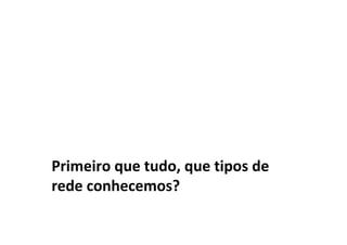 O documento discute os tipos de redes de computadores, incluindo PAN, LAN, MAN e WAN. Também fornece um resumo do programa de instalação e gestão de redes, abrangendo tópicos como topologias de rede, tipos de cabo, topologia em estrela, padrão Ethernet e instalação de uma rede em estrela. O documento menciona que a avaliação será contínua, com exercícios, e terá um projeto final de instalação de uma rede local.