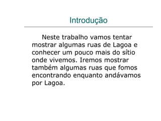 O documento descreve a origem e alguns locais e ruas da cidade de Lagoa em Portugal. Lagoa teria surgido em torno de uma lagoa cujos pântanos foram secados para criar terras férteis onde povos muçulmanos se instalaram. Algumas ruas de Lagoa incluem a Rua Pé da Cruz, nomeada por uma instituição de caridade localizada nela, a Rua Dr. Cirugião, e a Rua Jacinto Correia em homenagem a uma figura política local.