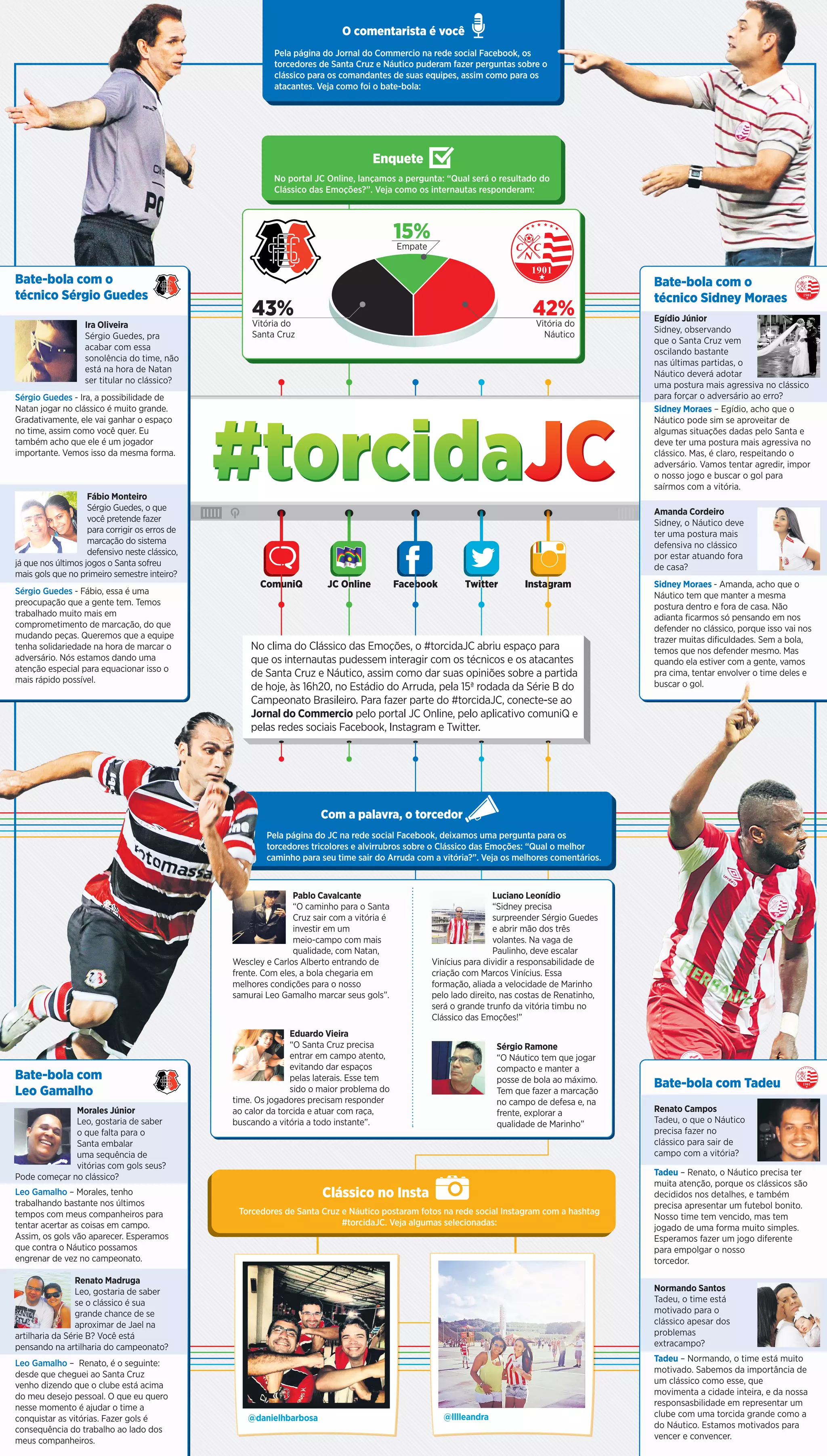 O documento relata uma interação entre torcedores de Santa Cruz e Náutico com os técnicos e atacantes dos times sobre o clássico entre as equipes. Torcedores postaram suas opiniões sobre o que é necessário para cada time vencer e os jogadores responderam perguntas sobre a partida.