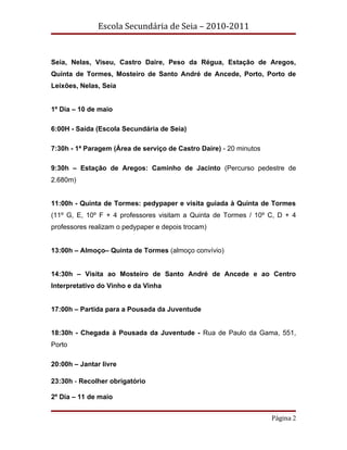 Este documento descreve uma visita de estudo de dois dias a locais relacionados ao livro "A Cidade e as Serras" de Eça de Queirós. Os alunos irão visitar a Quinta de Tormes, o Mosteiro de Santo André de Ancede, o Porto e o Porto de Leixões, com o objetivo de enriquecer seu conhecimento literário e cultural.