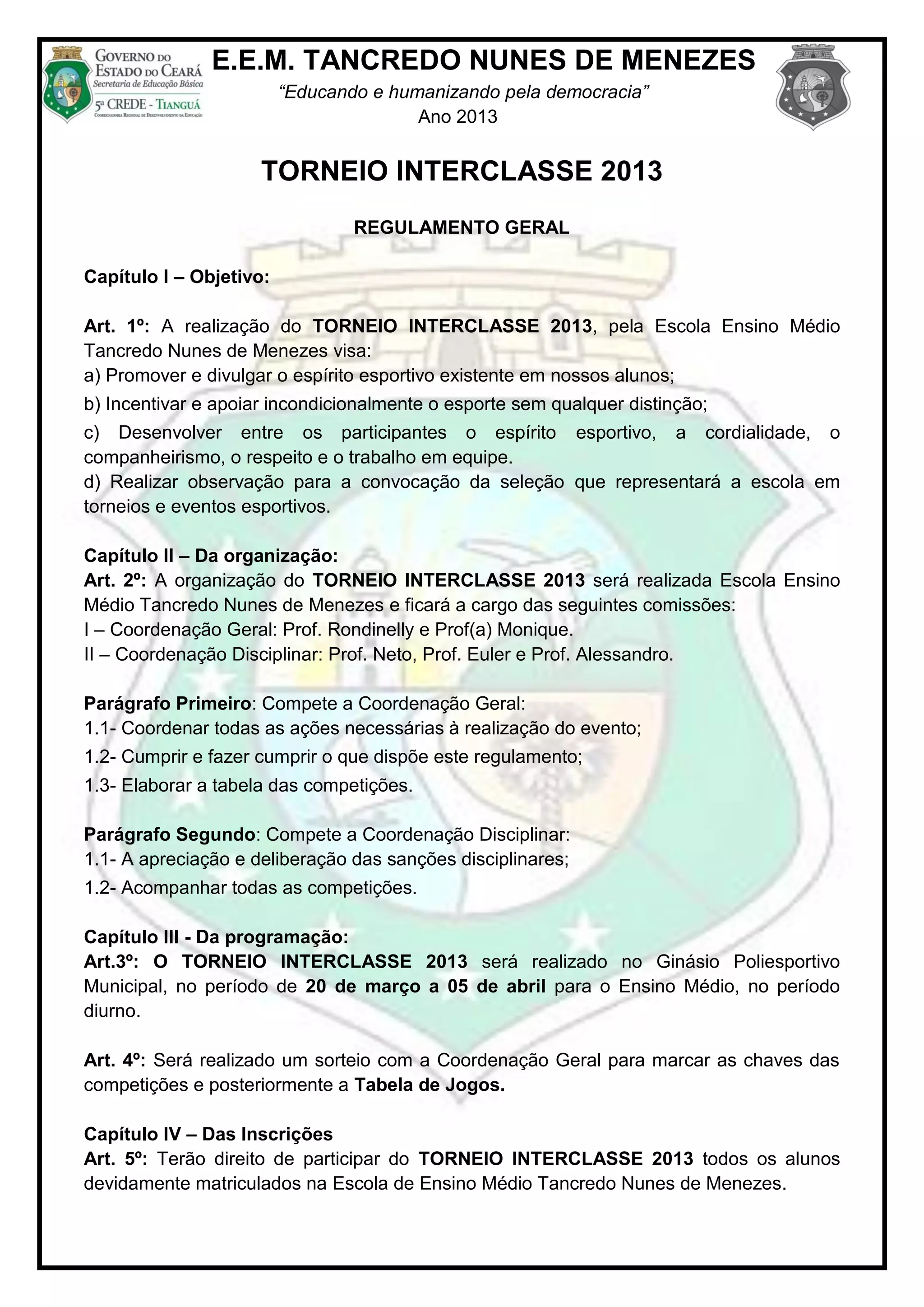 Este regulamento descreve as regras para o Torneio Interclasse de 2013 na Escola Ensino Médio Tancredo Nunes de Menezes. O torneio irá promover o esporte e o espírito de equipe entre os alunos e será realizado entre 20 de março e 05 de abril, com futebol e futsal masculino e feminino. As inscrições devem ser feitas online e cada aluno deve pagar uma taxa de R$5 para participar. O documento detalha as regras sobre uniformização, pontuação, classificação e premiação.