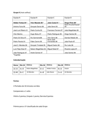 O documento descreve um torneio interno de futebol com dois grupos. O Grupo I é para os jogadores mais novos com 6 equipes jogando partidas de 6 minutos cada. O Grupo II é para os jogadores mais velhos com 4 equipes jogando partidas de 10 minutos cada. O documento lista os jogadores de cada time e o cronograma de jogos com os árbitros designados para cada partida.