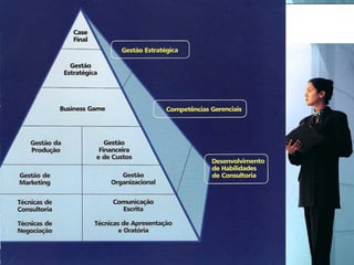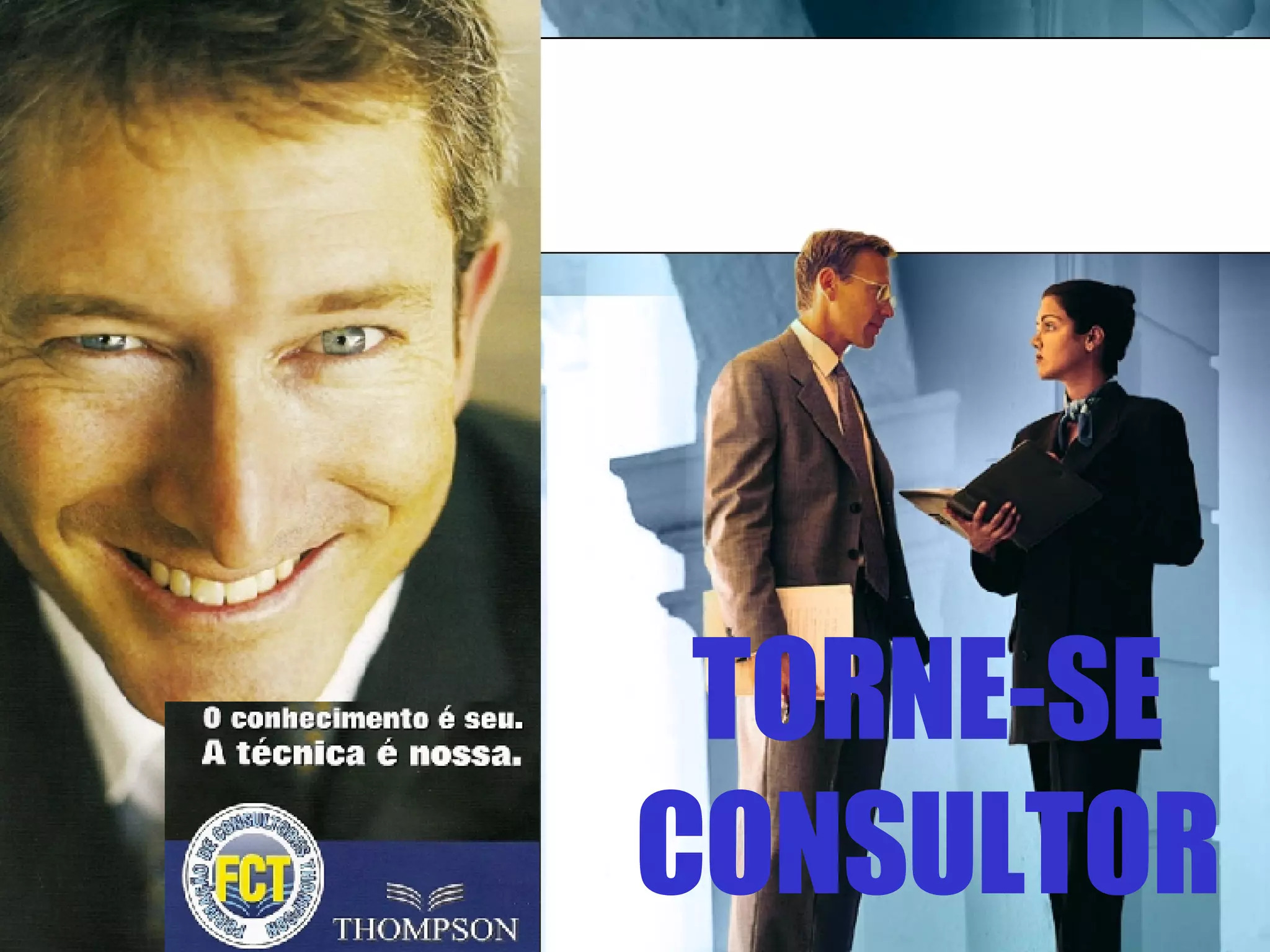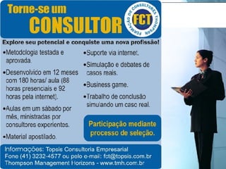 O documento descreve o Programa de Formação de Consultores Thompson (FCT) oferecido pela empresa Thompson em parceria com a TopSis Consultoria Empresarial. O programa capacita profissionais para atuarem como consultores independentes ou parceiros da Thompson, por meio de 180 horas de cursos online e presenciais ao longo de 10 meses.