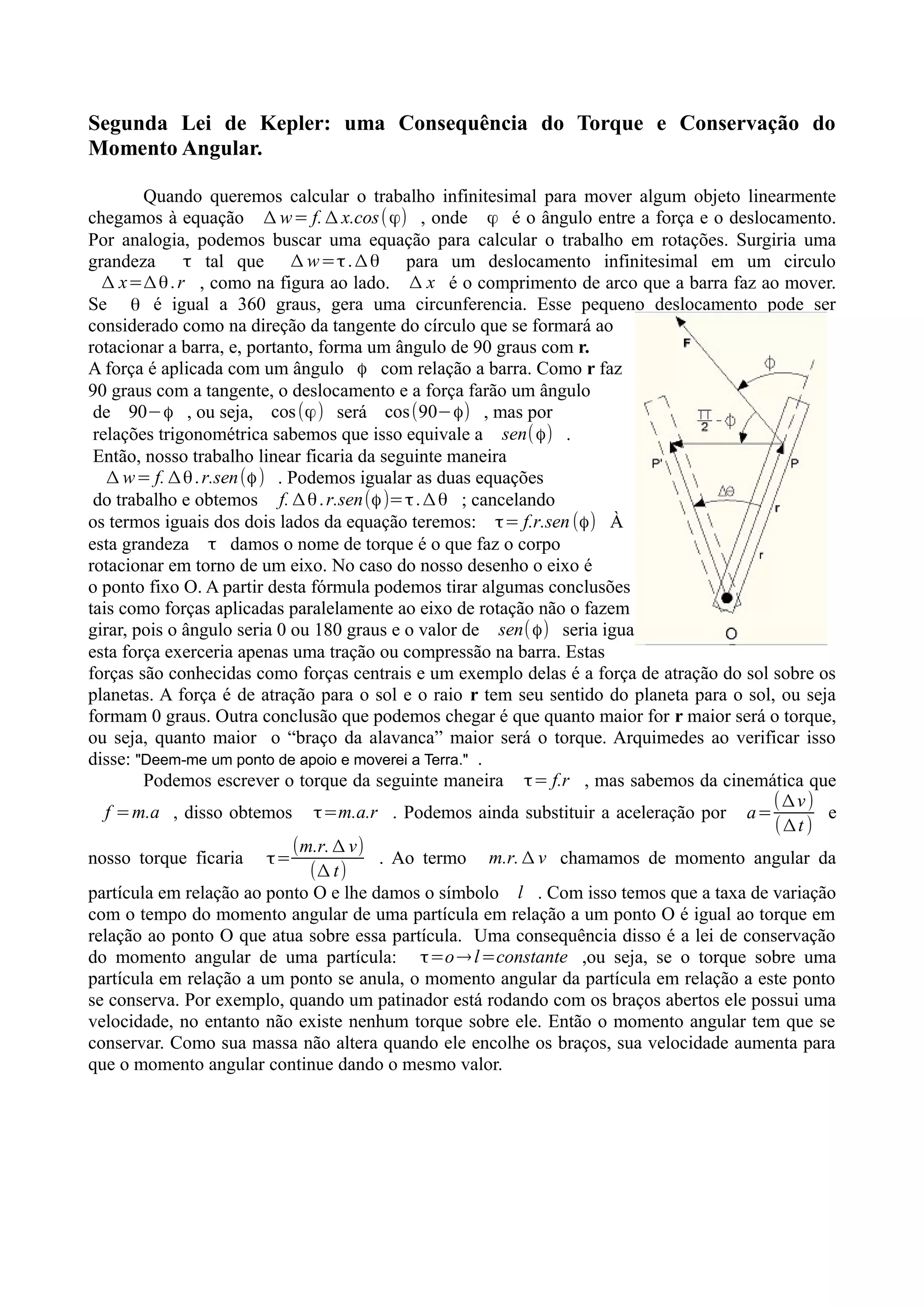 O documento explica como a segunda lei de Kepler é uma consequência do torque e da conservação do momento angular. Ele mostra que o torque sobre um planeta em órbita ao redor do Sol é zero, portanto o momento angular é conservado. Isso significa que a área varrida pelo planeta em intervalos de tempo iguais deve ser a mesma, o que corresponde à segunda lei de Kepler.