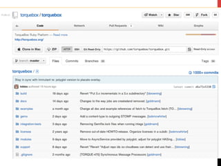 O documento apresenta o TorqueBox, um servidor de aplicações Ruby que roda sobre o JBoss permitindo executar aplicações Ruby com alta performance. O TorqueBox oferece funcionalidades como deploy e execução de aplicações Rack e Rails, agendamento de tarefas, filas de mensagens, clustering, alta disponibilidade e balanceamento de carga.