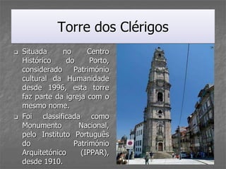 A Torre dos Clérigos é uma torre barroca de 75 metros de altura localizada no Porto, Portugal. Foi construída entre 1754-1763 e contém um carrilhão com 49 sinos, janelas com vistas panorâmicas da cidade, e escadas em espiral para os seus quatro andares. A torre é um marco arquitetônico proeminente no centro histórico do Porto.