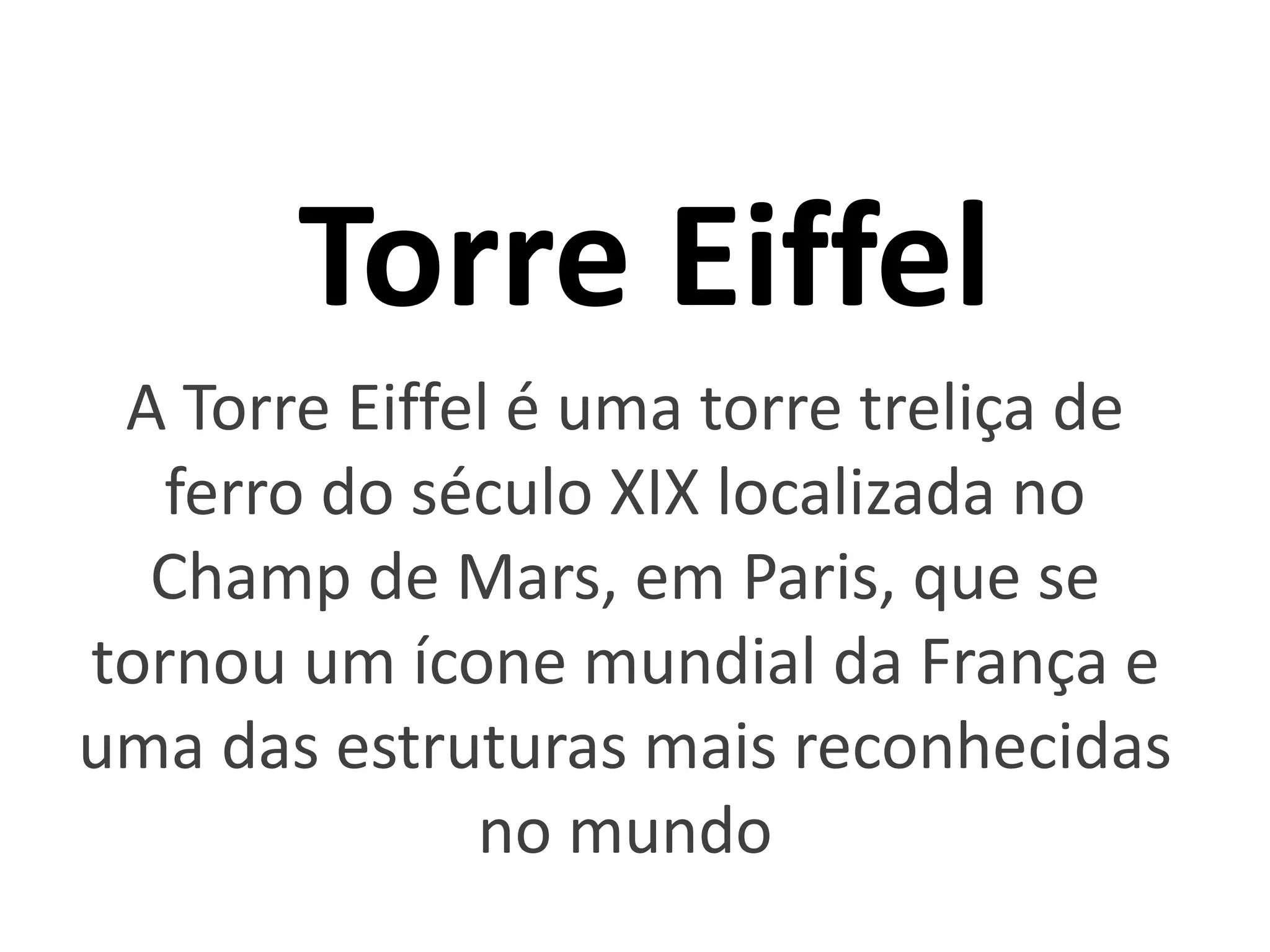 A Torre Eiffel é uma torre de ferro construída em Paris para celebrar os 100 anos da Revolução Francesa. Com 324 metros de altura, é uma das estruturas mais reconhecidas do mundo e atrai milhões de visitantes anualmente. Foi inaugurada em 1889 e se tornou um ícone mundial da França.