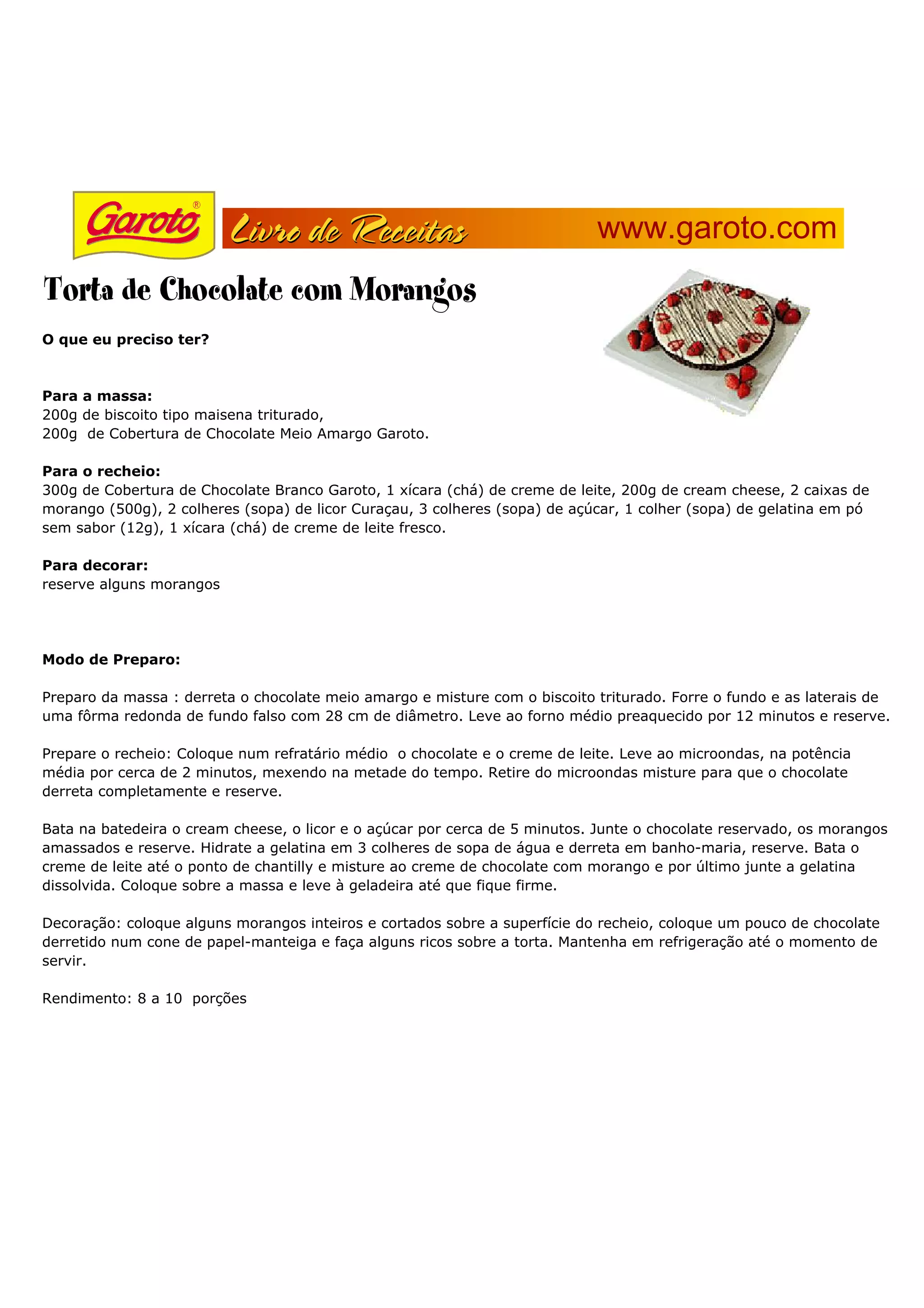 Este documento fornece a receita para uma torta de morango com recheio de chocolate. Ele lista os ingredientes necessários para a massa, recheio e decoração, incluindo biscoito maisena triturado, chocolates branco e meio amargo, creme de leite, cream cheese e morangos. Também fornece instruções passo a passo para preparar a massa, recheio e decoração, como derreter o chocolate, bater os ingredientes do recheio e colocar a torta para gelar antes de servir.