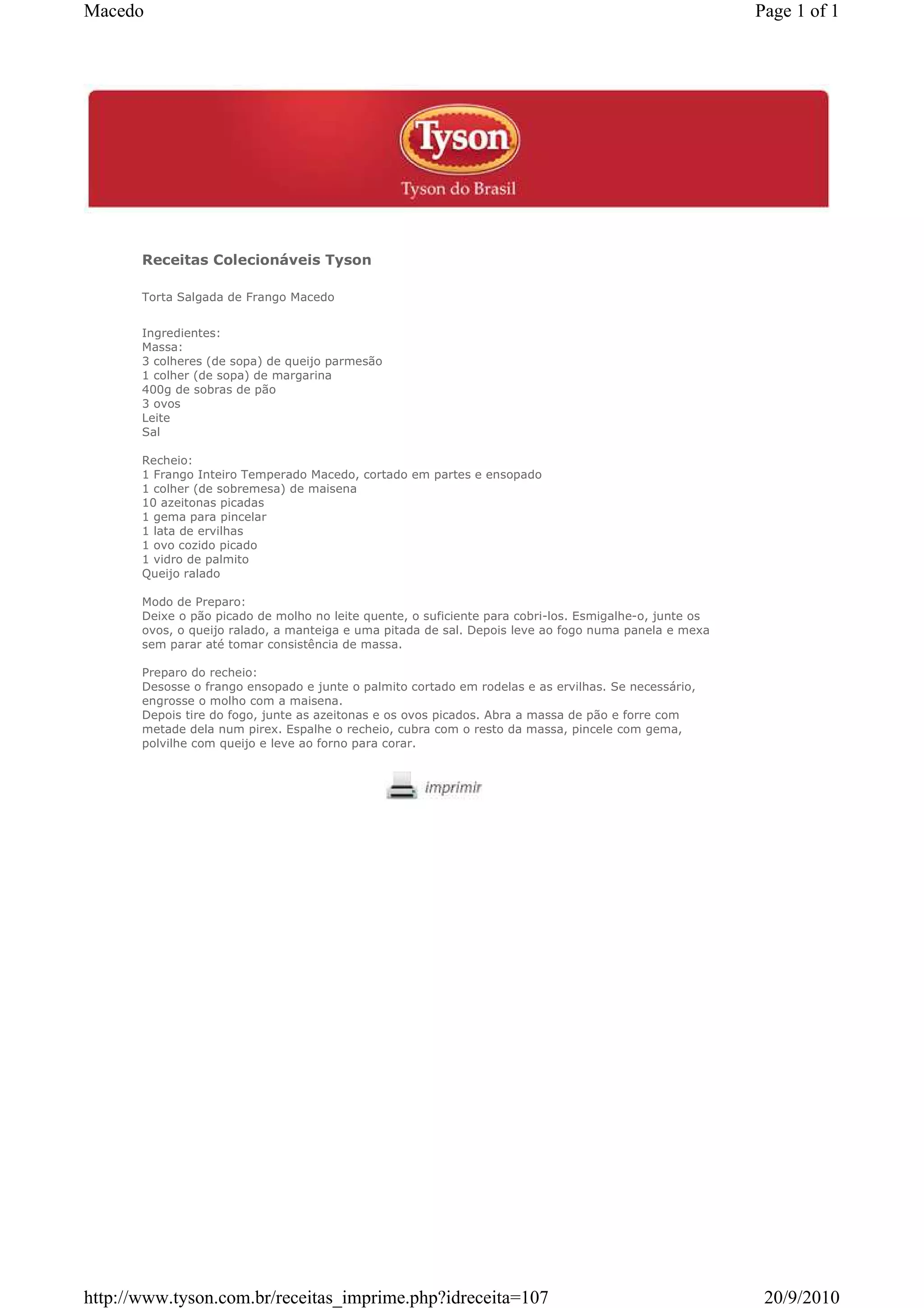 Este documento fornece a receita de uma Torta Salgada de Frango Macedo em 3 frases ou menos: A receita inclui uma massa de pão, queijo e ovos e um recheio de frango ensopado temperado com ervilhas, palmito e azeitonas. A massa é forrada em um pirex e coberta com o recheio antes de ser pincelada com gema de ovo e levada ao forno para corar.