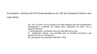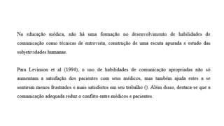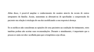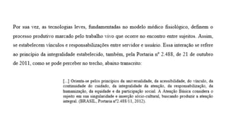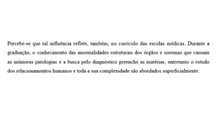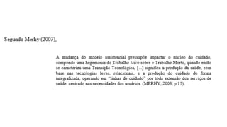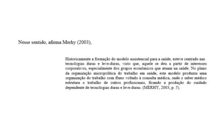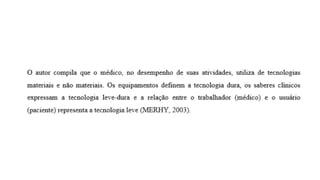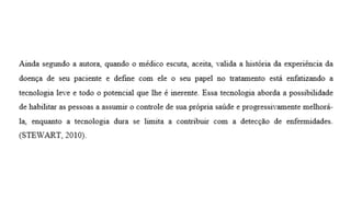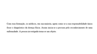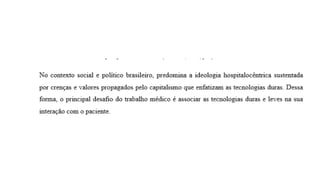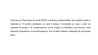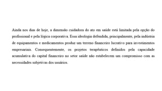 O documento discute a subjetividade na atenção à saúde e a necessidade do doente em ser cuidado. Apresenta que historicamente o xamã era quem cuidava da saúde e hoje esse papel é do médico. Também reflete sobre como a sociedade pode regular melhor a saúde para evitar o adoecimento.