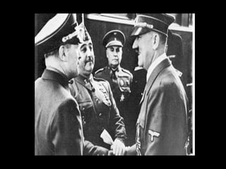 O documento descreve as características-chave dos regimes fascistas de Mussolini na Itália e Hitler na Alemanha, assim como do regime franquista na Espanha. Estes regimes eram nacionalistas, militaristas, anti-democráticos e anti-liberais. Eles suprimiram direitos e liberdades individuais e usaram terror e violência para se manter no poder.