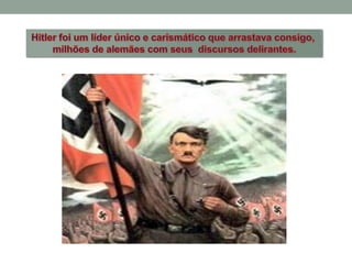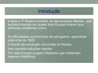 O documento descreve o surgimento e características do totalitarismo na Europa após a Primeira Guerra Mundial, com foco no fascismo italiano liderado por Mussolini e no nazismo alemão sob Hitler. O texto aborda as dificuldades econômicas e políticas que levaram ao fim das democracias liberais e ao surgimento de ditaduras totalitárias na Itália e Alemanha, assim como as principais características e ações desses regimes, incluindo o culto à personalidade do líder, o nacionalismo, o milit