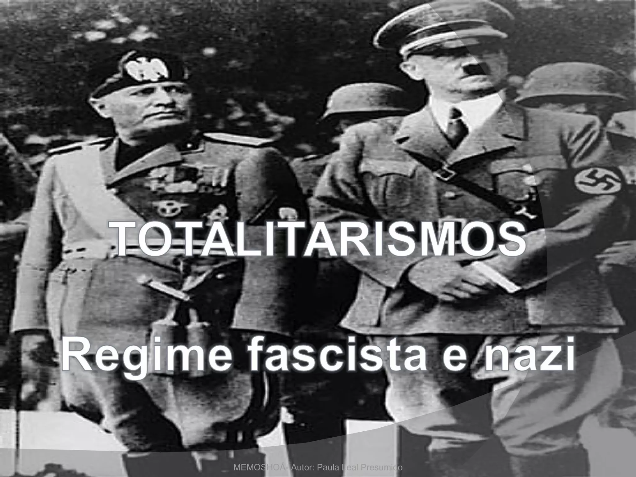 O documento descreve a ascensão do totalitarismo e dos regimes fascistas na Europa após a Primeira Guerra Mundial e a Grande Depressão. Detalha os princípios ideológicos do fascismo italiano de Mussolini e do nazismo alemão de Hitler, incluindo o culto da personalidade, nacionalismo, anti-semitismo e o controle totalitário do Estado sobre a sociedade.