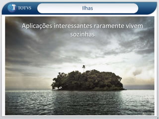 O documento discute a integração de sistemas heterogêneos através de uma abordagem baseada em serviços (SOA) utilizando um Enterprise Service Bus (ESB). O TOTVS ESB é apresentado como uma solução completa para integrar aplicações de forma flexível, independente de plataforma ou tecnologia, com monitoramento e configuração gráfica.