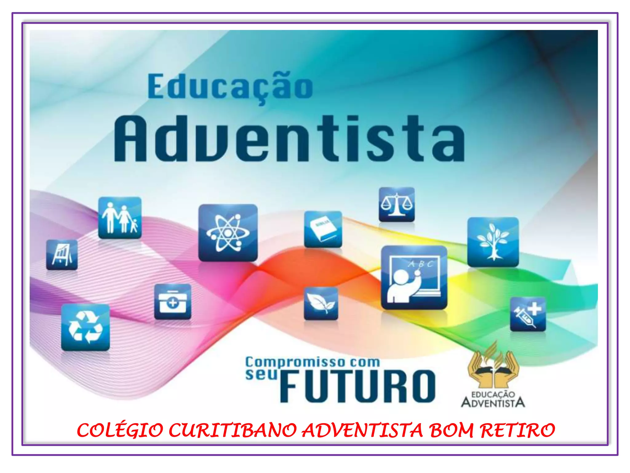 O documento descreve as instalações e atividades oferecidas pelo Colégio Curitibano Adventista Bom Retiro, incluindo sua fachada, playground, educação integral, casa na árvore, fazendinha, animais, escola de música, ginásio de esportes, biblioteca, sala de aula equipada com lousa digital, computadores e internet, sala de música, brinquedoteca, horta e mais.