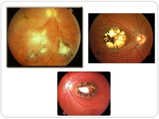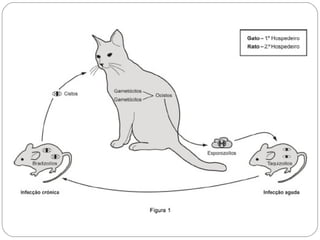 O documento descreve o ciclo de vida e transmissão da toxoplasmose, causada pelo protozoário Toxoplasma gondii. O parasita se reproduz assexuadamente em hospedeiros intermediários e sexualmente em felinos, seus hospedeiros definitivos. A transmissão ocorre principalmente pelo consumo de carne crua ou contaminação com fezes de gatos infectados. O documento também aborda sintomas, diagnóstico e tratamento da doença.