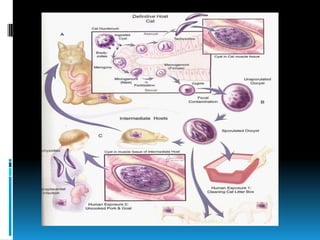 A toxoplasmose é uma doença infecciosa causada pelo protozoário Toxoplasma gondii, encontrado em fezes de gatos e outros felinos, podendo afetar humanos e outros mamíferos. Os sintomas variam desde assintomáticos até problemas graves, especialmente em casos congênitos, e o tratamento envolve antibióticos, principalmente em grávidas. A prevenção inclui evitar o consumo de alimentos crus ou mal cozidos e a realização de exames periódicos durante a gestação.