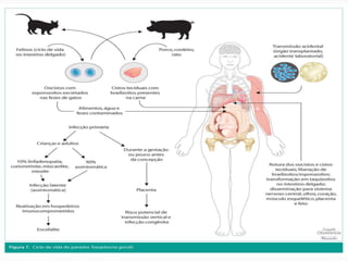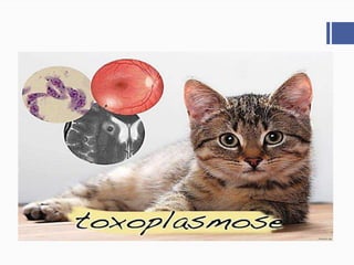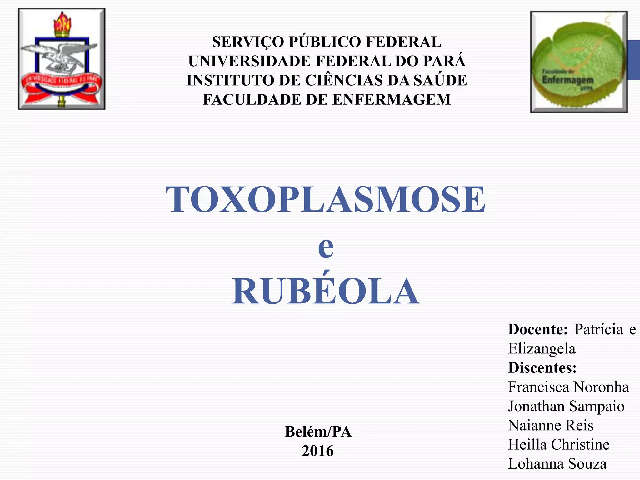 O documento discute toxoplasmose e rubéola, doenças que podem afetar mulheres grávidas. Apresenta informações sobre o ciclo de vida, transmissão, sintomas, diagnóstico e tratamento da toxoplasmose, incluindo a forma congênita, assim como sobre a rubéola e a síndrome da rubéola congênita. Também discute a sistematização da assistência de enfermagem para esses pacientes.