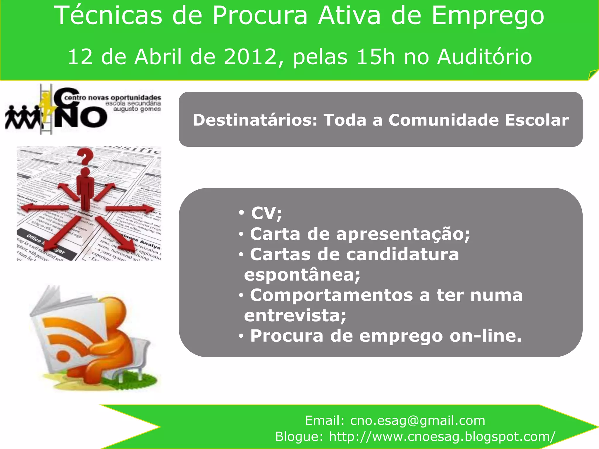 A palestra abordará cinco técnicas de procura ativa de emprego, incluindo como criar um CV, carta de apresentação e candidatura espontânea bem como dicas para entrevistas e procura de emprego online. A palestra será realizada no Auditório em 12 de Abril às 15h e é aberta à toda a comunidade escolar.