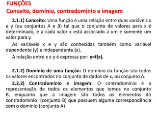 O documento discute funções matemáticas, incluindo conceitos como domínio, contradomínio e imagem. Apresenta exemplos de funções afins e quadráticas, mostrando como representá-las graficamente e resolvendo equações e inequações do primeiro e segundo grau.